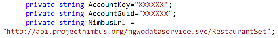 2. Declare 3 string variables, calling them “AccountKey”, “AccountGuid” and “NimbusUrl” respectively. Instantiate the first two with your nimbus account key and a guid respectively. Instantiate the 3rd key with your nimbus dataset url.