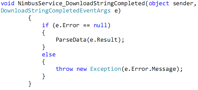4. In the constructor of the Nimbus Class, instantiate the WebClient and add an event handler for it’s “DownloadStringCompleted” event.
