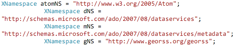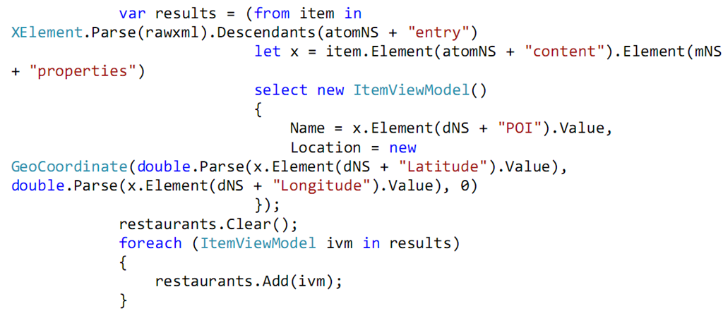 8. In the parse data method, do a linq query to parse your data and retrieve the name of the restaurant as well as its location. Store the name and location into the item.