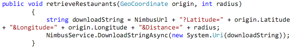 9. Finally write a entry method that could be used by the main class to start the retrieval of data, we shall call this method “retrieveRestaurants”. It takes in 2 parameters, one of type GeoCoordinate which is the current location’s value, the second being the radius, in meters.