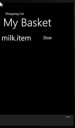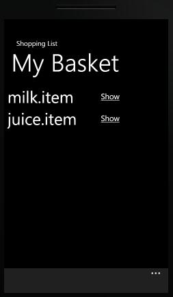 11. We add a listBox in MainPage.xaml in order to display all the existing shopping lists. Add the coding below into <Grid x:Name=“ContentGrid” …> [cc] [/cc] 12. Now we will retrieve whatever shopping list the user has saved. Insert the following code into MainPage constructor (public MainPage()) right after InitializeComponent(). [cc] Loaded += (object sender, RoutedEventArgs e) => { Files.Items.Clear(); using (IsolatedStorageFile storage = IsolatedStorageFile.GetUserStoreForApplication()) { foreach (string filename in storage.GetFileNames("*.item")) { Grid a = new Grid(); ColumnDefinition col = new ColumnDefinition(); GridLength gl = new GridLength(200); col.Width = gl; a.ColumnDefinitions.Add(col); ColumnDefinition col2 = new ColumnDefinition(); GridLength gl2 = new GridLength(200); col2.Width = gl; a.ColumnDefinitions.Add(col2); TextBlock txbx = new TextBlock(); txbx.Text = filename; Grid.SetColumn(txbx, 0); HyperlinkButton btn = new HyperlinkButton(); btn.Width = 100; btn.Content = “Show”; btn.Name = filename; btn.NavigateUri = new Uri("/DisplayPage.xaml?item=" + filename, UriKind.Relative); Grid.SetColumn(btn, 1); a.Children.Add(txbx); a.Children.Add(btn); Files.Items.Add(a); } } }; [/cc] Here, we are trying to create a dynamic grid layout on fly with two columns. One is for displaying the file name and the other is to display a hyperlinkButton that tight to file name. We will build a DisplayPage.xaml for displaying details of the shopping item later on. Noticed, [cc]btn.NavigateUri = new Uri("/DisplayPage.xaml?item=" + filename, UriKind.Relative);[/cc]Here, we use /DisplayPage.xaml ? item=.. to pass value of that specific item to the next page so that we know which shopping list’s information we should display. This is very similar to how we pass parameters between web pages. Files here are the listBox functions as a container where content got displayed. 13. Now go back to MainPage.xaml. Press Ctrl+F5 and try to compile the file. Firstly, try to create some items if you don’t have any. And after that, you should be able to see something like this: You could truncate file name to display item name more friendly.