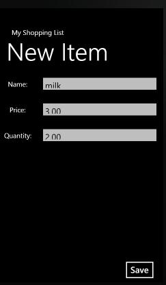 Let me explain the code here. Inside a grid, there are two types of definition. One is RowDefinition. As you can see here, we populate three rows with minheight 72.5 and the Grid will auto-fill the last row with proper height. The another one is ColumnDefinition. Here we specify them as 100* and 346*, which means the whole column width was devided by 100+346=446 units and the first column takes 100 units and the second column takes 346 units. In each TextBlock, take the first one as a example. Grid.Row=“0” and Grid.Column=“0” indicate this TextBlock cell located in the first row and first column of the Grid. The rest components of the UI I believe are quite straight-forward to understand. 6. Choose Save button in the UI and double-click. It will bring you to the code-behind, which is BtnSave_Click method. 7. Add two namespaces that we will be using later. [cc] using System.IO.IsolatedStorage; using System.Xml.Linq; [/cc] 8. Insert the following code to BtnSave_Click method: [cc] using (IsolatedStorageFile storage = IsolatedStorageFile.GetUserStoreForApplication()) { XDocument _doc = new XDocument(); XElement _item = new XElement(nameTxt.Text); XAttribute price = new XAttribute(“price”, priceTxt.Text); XAttribute quantity = new XAttribute(“quantity”, quanTxt.Text); _item.Add(price, quantity); _doc = new XDocument(new XDeclaration(“1.0”, “utf-8”, “yes”), _item); IsolatedStorageFileStream location = new IsolatedStorageFileStream(nameTxt.Text + “.item”, System.IO.FileMode.Create, storage); System.IO.StreamWriter file = new System.IO.StreamWriter(location); _doc.Save(file); file.Dispose(); location.Dispose(); NavigationService.Navigate(new Uri("/MainPage.xaml", UriKind.Relative)); } [/cc] XElement is a class that represents an XML element and the fundamental XML construct. And XAttribute is used to create attribute for a specific XML element. You could check out details here. Here, we construct a XML as the following output: