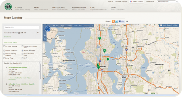 Starbucks also has a store locator page in the home page. It could help users to check out strabucks store nearby. Meanwhile, it provides social component that user could share the store information on Facebook. And you can check out the site here.