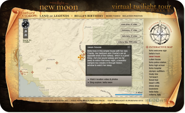 Twilight New Moon Moive production built a movie information site that utilizing Bing map. Fans could check out story lines based on different locations. You could check out this interesting site here.