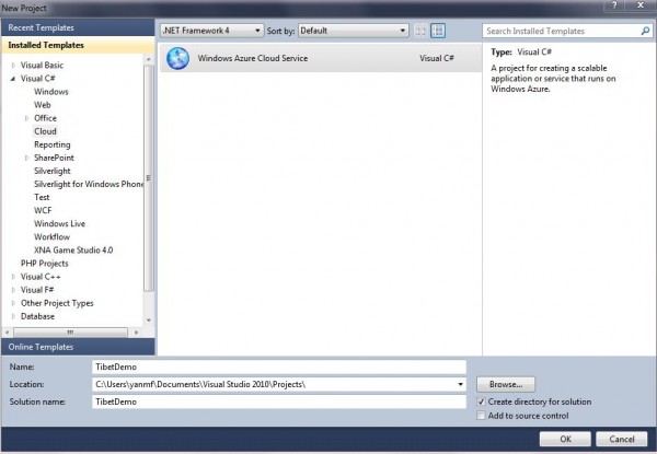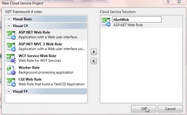 10. Select ASP.NET Web Role and to Cloud service solution and rename it as tibetWeb showed as below: