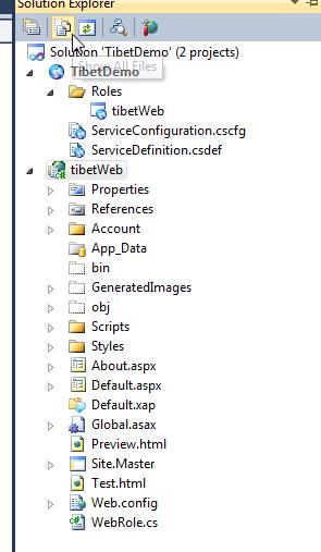 11. Now, copy over files from XXDocumentsExpressionDeep Zoom Composer ProjectsTibet-DemoExported Datatibet_demo (you may look for your own file directory) under this project. A quick way is to right click on tibetWeb and open folder in windows explorer. 12. Click on Icon [Show all Files] showed below and you will see folder GeneratedImages showed in a dash line. Right-Click and select Included in the project.