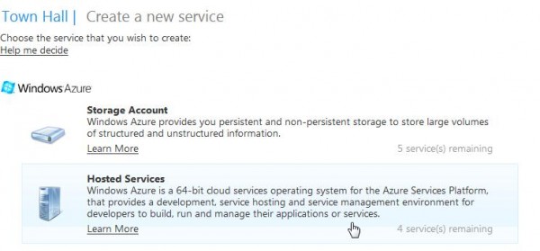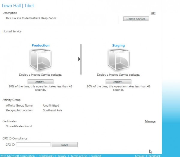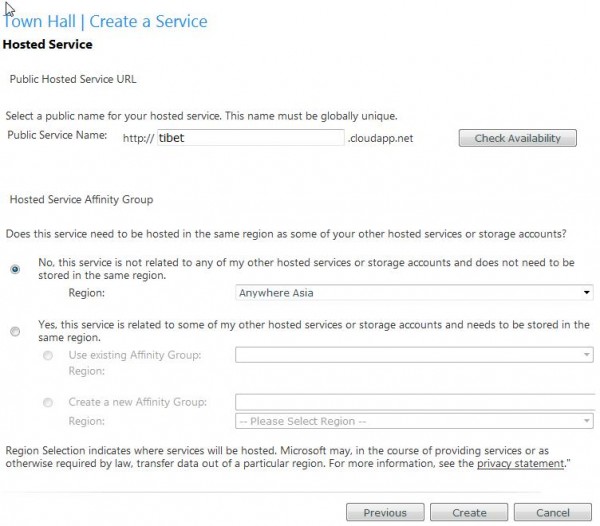 13. Open Web.Config and add in codes showed below to set the default starting page as Test.html. You need to modify the web.config file and add the following setting in the <system.Webserver> section: [cc lang=‘c’] [/cc] 14. Now compile and build your page. You could set Test.html as Start page by right clicking Test.html and test your Silverlight page locally. 15. Right Click on TibetDemo Cloud project and select Publish… and Select Create Service Package Only… You will be able to see a folder pop up with all the publish documents. Lastly, we will show you how to Deploy Windows Azure Application on Cloud. 16. You need to go and register here for a Azure account if you don’t have one. 17. Create a new service under your Cloud server, choose Hosted Service showed as below: