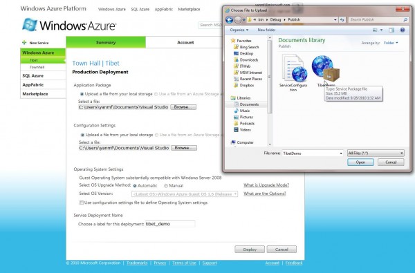 21. Click on Deploy… and you will see a dialog showed as below. Select the folder where you Published your Cloud Service just now. Choose Application Package for the first Browse Button and choose configuration settings for the second Browse Button. Click on Deploy and application is deploying to the Cloud for you now.