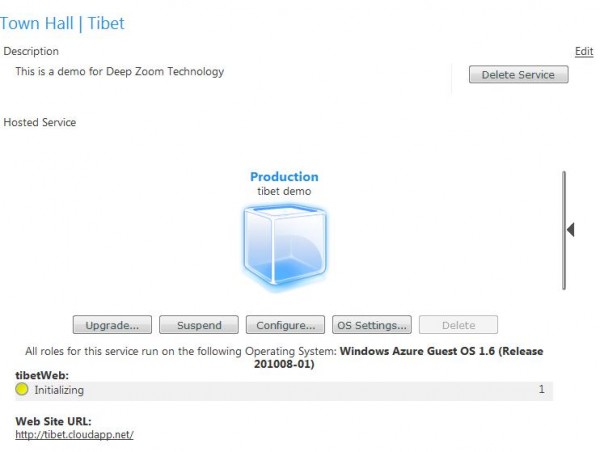 23. Remember that the computing hour is counted once the tube is blue. You need to click on suspend to stop the service. Now you can see the app up and running! Check out http://tibet.cloudapp.net/ to see this up and running demo!