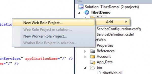 9. Right click on Role Folder under TibetDemo project and select New Web Role Project…