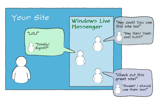 Messenger Connect is a collection of APIs and controls that allow you to build applications so people can communicate, and share with their Messenger friends. Applications build with Messenger Connect provide seamless social experience that combines your content with popular Windows Live features such as chatting with friends, sharing status updates and activity streams.