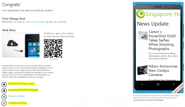 You’re almost done with your app. It’s the final step… In which you can Generate, Install and Test your app in your windows phone. There is an additional option to download the source code for further advanced coding, or else you can just download the compiles .xap file and publish in the Windows Phone Store.