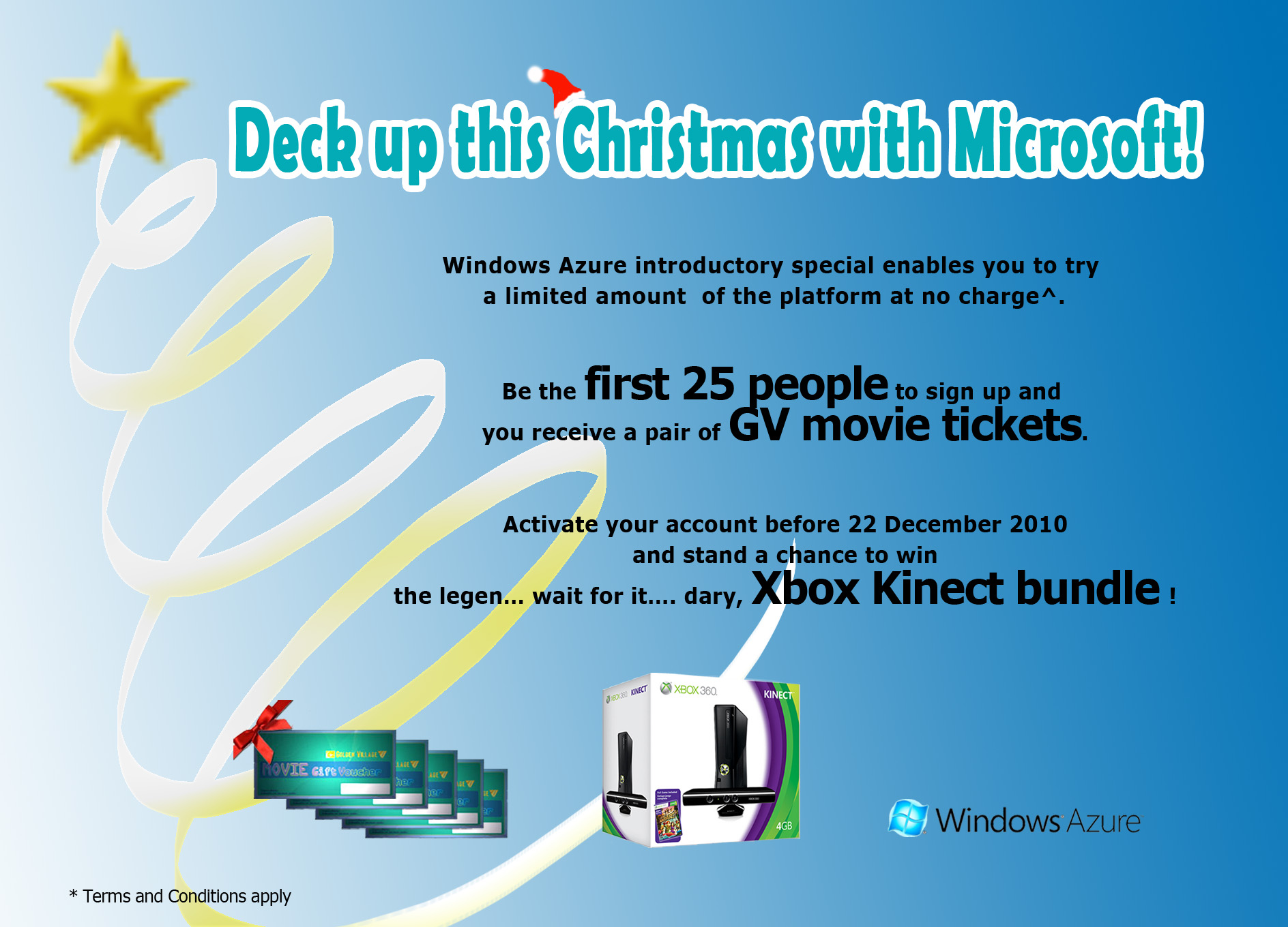 How to win the Xbox Kinect bundle? Step 1: Go to http://www.microsoft.com/windowsazure/offers/ Step 2: Scroll down to ‘Standard Offers’ Step 3: Click on ‘Introductory Special’ and sign up. Step 4: Send us your purchase confirmation email, full name, address, contact details to v-kilaum@microsoft.com Terms & Conditions:
