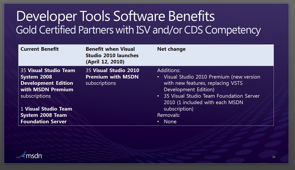 Visual Studio 2010 announcements and impact on MPN – This is a very good resource that describes the changes that this launch will bring to the Microsoft Partner Network, in terms of SKUs that Certified/Gold Certified ISVs (and other partners) will receive the the Microsoft Partner network. In summary: