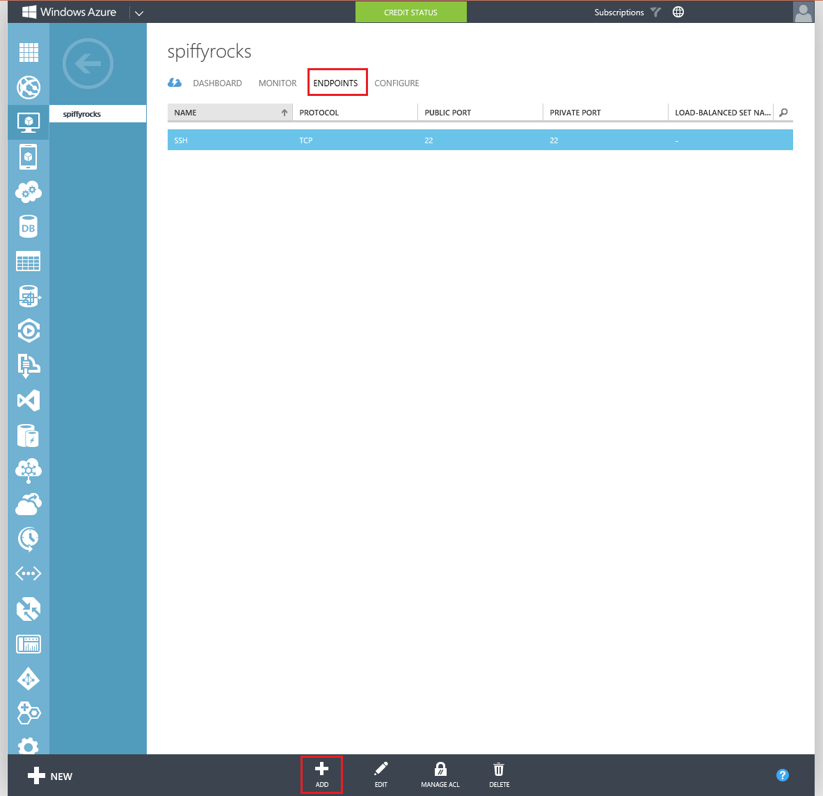 Go to the Endpoints Tab in your Virtual Machine once it’s been created and hit the add button at the bottom. Both buttons have been highlighted in the image below.
